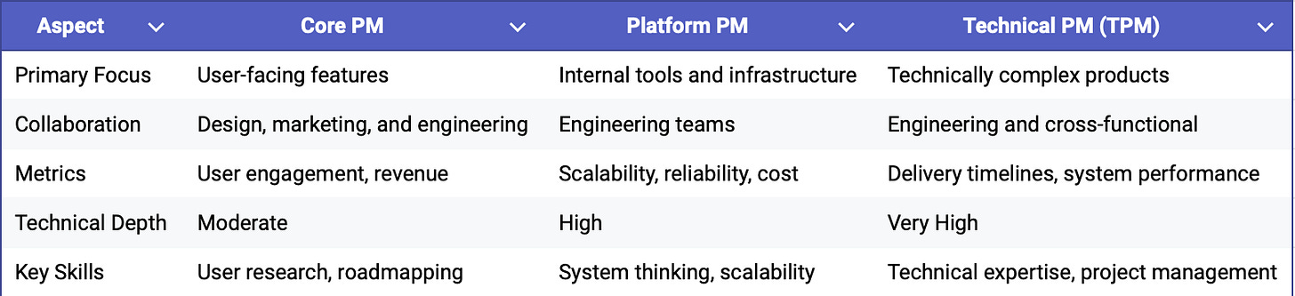 AspectCore PMPlatform PMTechnical PM (TPM)Primary FocusUser-facing featuresInternal tools and infrastructureTechnically complex productsCollaborationDesign, marketing, and engineeringEngineering teamsEngineering and cross-functionalMetricsUser engagement, revenueScalability, reliability, costDelivery timelines, system performanceTechnical DepthModerateHighVery HighKey SkillsUser research, roadmappingSystem thinking, scalabilityTechnical expertise, project management